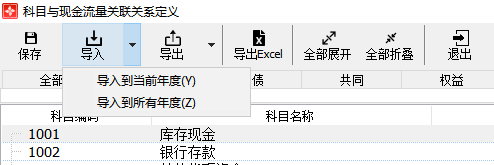 2 )在‘科目与现金流量关联关系定义’界面(参照图 2 ),点击〖导入〗,选择和账套行业同名的现金流量对照表文件。