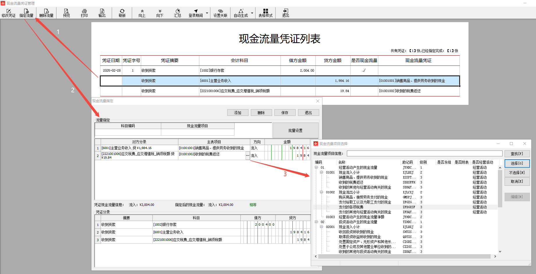 2 ) 在 ‘ 现金流量凭证管理 ’ 界面, 选择凭证并点击〖指定流量〗(或是双击凭证)。